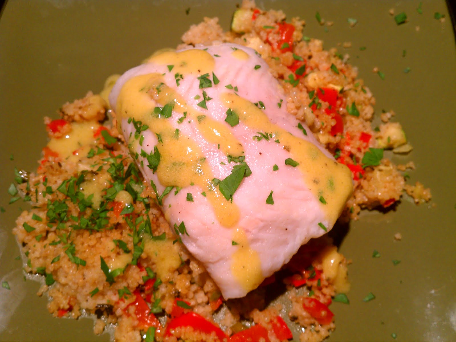 2. Dividing evenly, spread 1TBL Dijon over one side of fish; season with salt and pepper. Roll up each fillet, and place on top of couscous. Cover, and microwave on high until fish is almost cooked through, about 4 minutes. Let stand, covered, 5 minutes to finish cooking. (If the fish is not opaque at this point, as mine wasn't, just put it back in the microwave for 2 more minutes and let rest again).